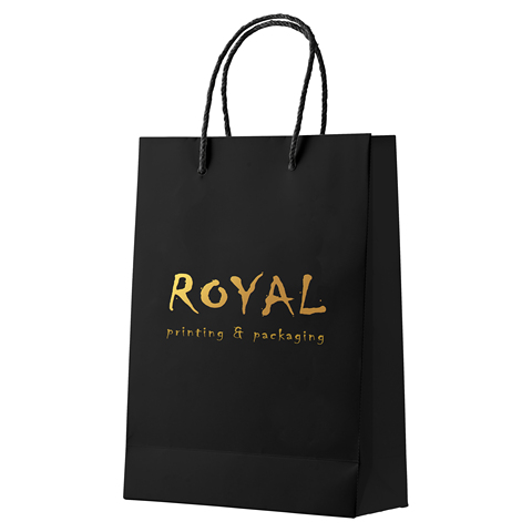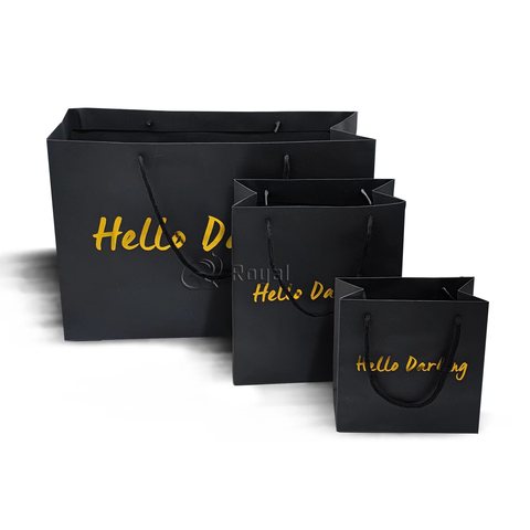 Bolsa de papel Estampado en caliente con asas de cuerda de algodón Logotipo dorado Bolsa de papel recubierta de negro mate